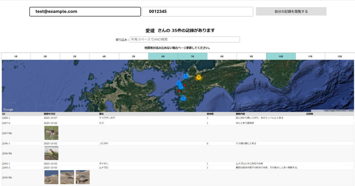 日本野鳥の会愛媛の会員の方は、送信した記録を個人記録閲覧ページにて一覧できます。閲覧ページのURLは、上記フォーム投稿時に送られる自動返信メール内に記載されています。会員の方は、投稿したメールアドレスとご自身の会員番号でログインして、ご覧ください。